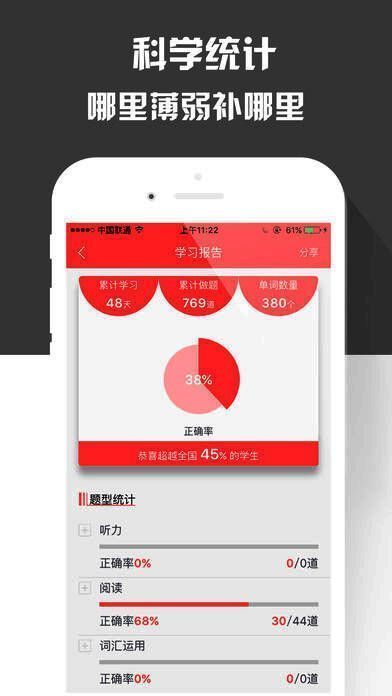 5、完整的学习报告:精准直击四级、六级、考研、考研英语学习弱点,让备考更高效。