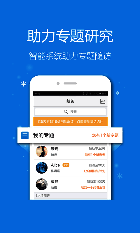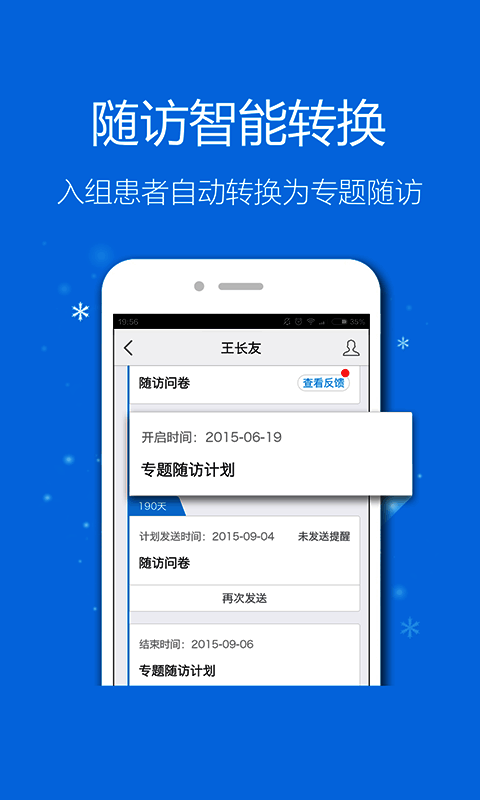 1、易随访:支持专题随访和常规随访,定期收集患者康复进展情况。