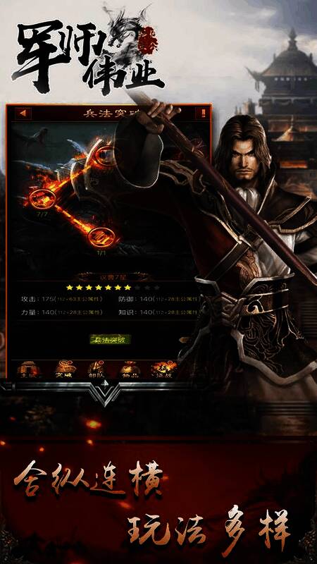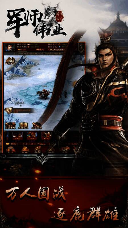 热血国战,讨伐群雄,玩家能在烽火连天、群雄割据的乱世中成就最强英雄。这是自由实时沙盘战略手游,玩家机会均等,可争夺每一寸土地,还能发展内政、招募将领、结交盟友,决定是乱世纷争还是天下一统。