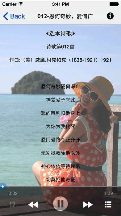 《选本诗歌》是专门为广大基督教徒打造的一款诗歌类播放器。它收录了350多首诗歌,能实现本地播放,无需下载。希望万能的主在荣耀国度权力至上,直至永远。