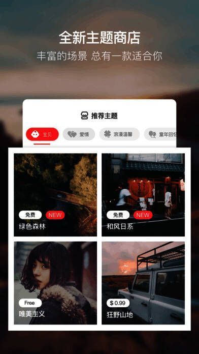 【多种超炫主题】实时掌握最新主题,不定时更新当下流行的炫酷主题,由专业团队运用新技术打造,让相册电影独具特色。