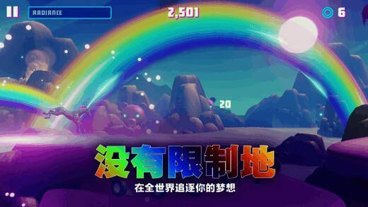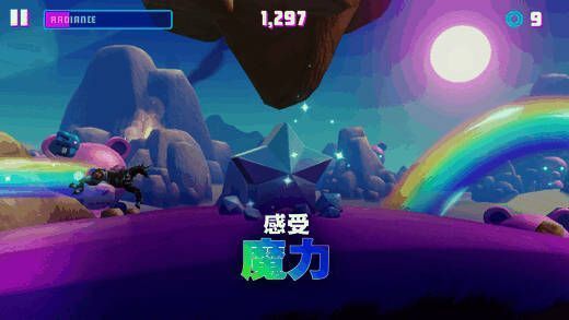 2、玩法基本延续前作,玩家要尽可能跑远距离。操作简单,左侧屏幕跳跃,右侧屏幕无敌冲刺,可二段跳,长按跳跃能远距离跳跃,独角兽奔跑和空中姿态优雅舒展;