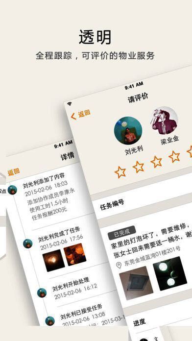 - **更多一份阳光**:可对服务打分、监督设备维保,推行阳光物业;遵循一套服务标准,共同提升物业细节。
