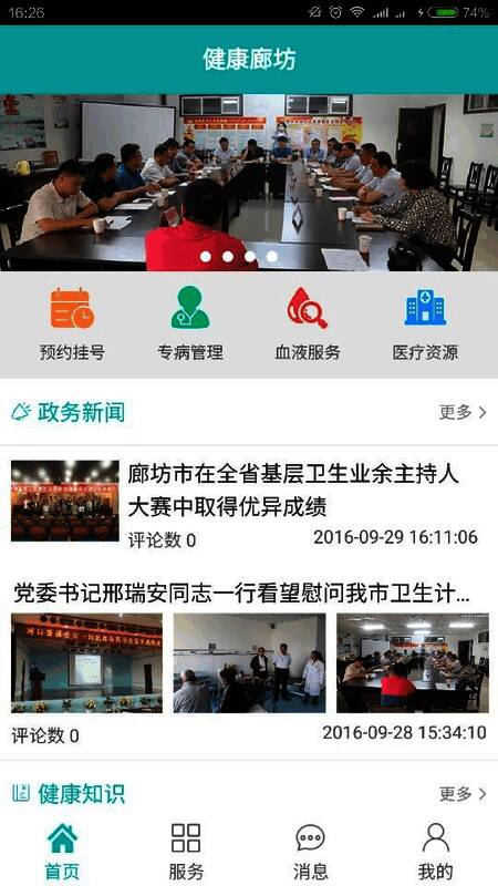《健康廊坊》App为用户提供疫情自查上报服务,足不出户就能及时提供相关信息,利于疫情精准防控,减轻工作人员负担。还可查看切换区域的新闻,显示第三方创建的事件信息,提供登记、献血等服务。