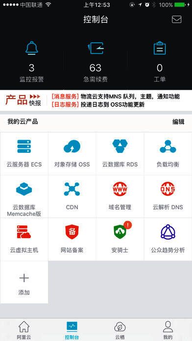用 APP 查看产品监控:支持六大云产品监控信息实时查询,多维度指标关注业务。还能按喜好定制重点监控指标在首页,支持单实例关注和多实例对比。