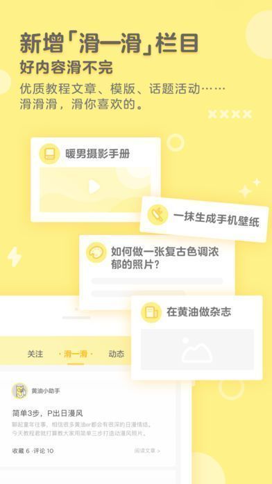 1、新增「滑一滑」栏目:有优质教程文章、模板、话题活动等,任你滑动选择喜欢的。