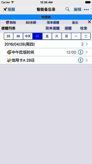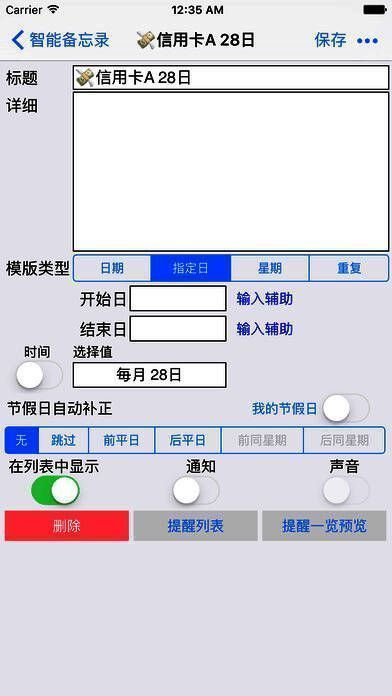 支持可视化提醒,能依据事先定义的提醒模式自动生成提醒。即便修改或删除某个提醒,也不会影响其他提醒。按日显示提醒列表,清晰明了,一次只显示一天的提醒,方便查看。还可以定义假日,提供丰富的提醒模式,会根据假日自动调整生成提醒。