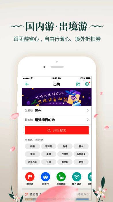 6、出境游:可预订全球热门目的地的旅游团、半自助游,跟团或自助任你选择。