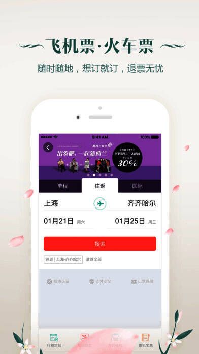 2、机票:提供接送机服务,可预订国内所有航线的打折机票,还能实时查询航班动态。