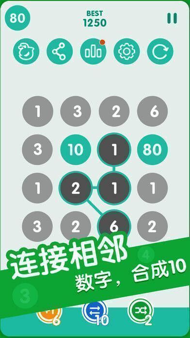 把数字任意方向相连,让总和为 10 就能合并。比如 10 与 10 相连成 20,20 与 20 相连成 40,以此类推。在数字的世界里,得有全局观才能玩得更好!