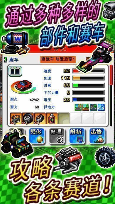 1、开罗官方全新模拟经营游戏;2、像素卡通风格与简单经营玩法;3、玩家化身车队老板;4、培养车手、拉拢赞助商称霸大奖赛;5、强化部件、组装赛车,成为全国最快车队。