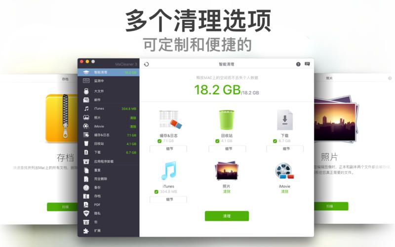 可自定义清洁:支持智能清洗,能快速扫描和清洁整个系统;也可选择性清洁,比如进行iTunes清洁、照片清理、缓存和日志清理等。