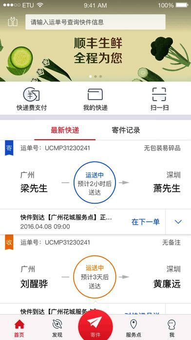 - 我要寄件:填写订单寄件,可设置默认寄件人,将未完成订单保存到草稿箱。寄件时可进行运费、收送范围、禁寄品查询,自动定位寄件人位置,从手机通讯录或顺丰地址簿选择收寄件人信息,还能添加或删除多个收件人。