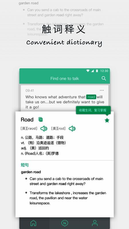 每天推荐经典 TED 演讲视频,轻松学英语;经典每日一句推荐,支持跟读、打分测试及语音和图片评论;提供查词和翻译功能,支持语音翻译,可快速加入单词本,阅读、图书、听力场景均可点击词语翻译,结合单词本学习。