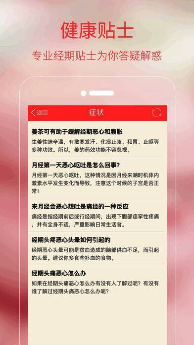 4、【症状贴士】提供健康贴士,解答经期问题,体验免费妇科医疗服务。