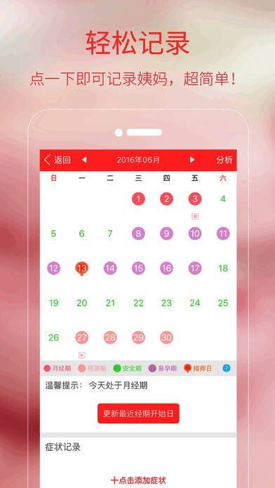 2、【轻松记录】一键操作,轻松记录月经日期。