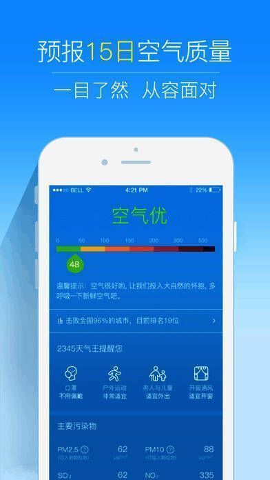 2. 可实时查询空气质量,PM2.5清晰可见,还有空气质量预报,让你从容应对雾霾污染。