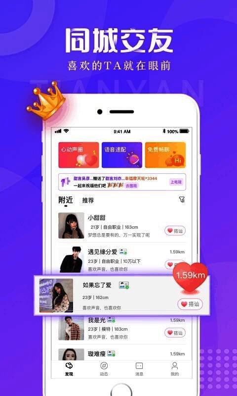 《甜言》是一款实用又强大的聊天交友软件。在这里,你能结交志同道合的朋友,平台用户安全可靠,会自动匹配附近合适的陌生人,聊得来还能线下见面,交友模式简单直接。