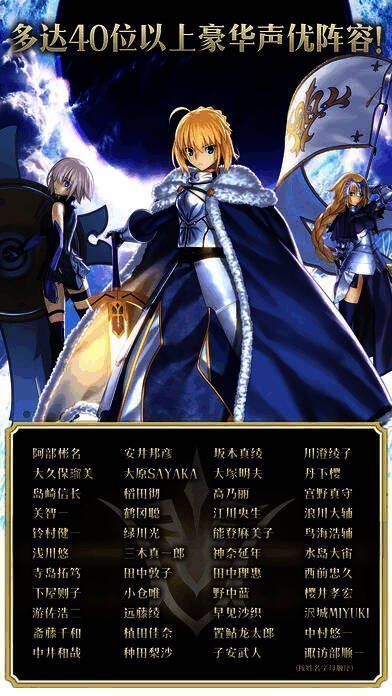 4、50多位知名画师参与英灵绘制,40位以上声优倾情献声!《FGO》邀请武内崇等50余位知名画师组成超豪华美术团队,还特邀Fate系列原班声优参与配音。