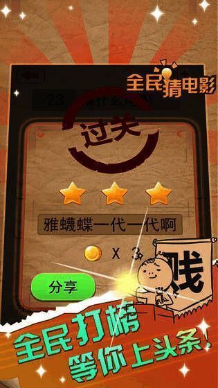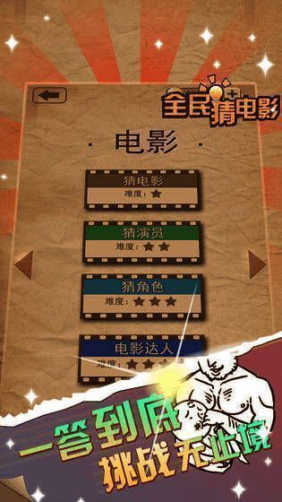 《全民猜电影》是一款休闲益智游戏。玩家在游戏里聆听经典电影对白,进而猜出电影、演员或角色。游戏设有四个难度等级,还能使用道具降低难度。游戏中经典片段让人乐在其中。