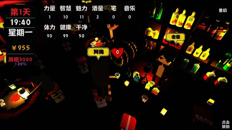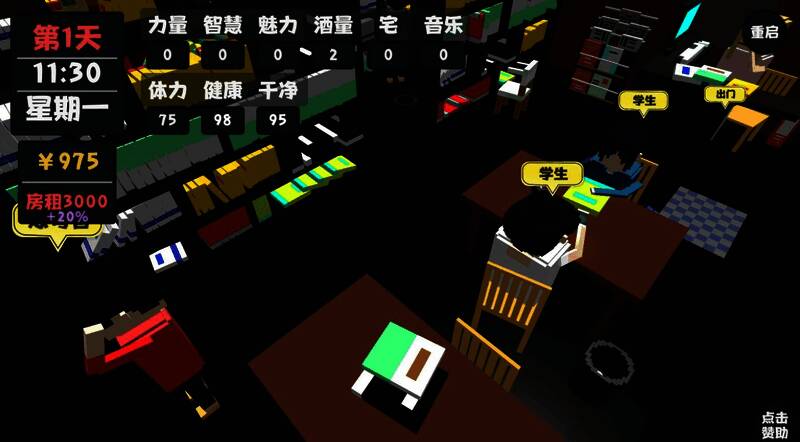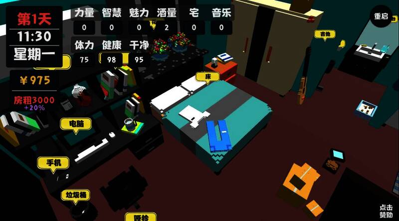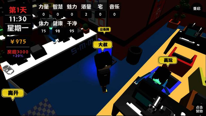 《属性生活》是一款3D像素风格的模拟生存游戏,其终极目标就是尽可能长时间地生存下去。玩家需要不断外出赚钱以满足基本生活开销,但过度工作会损害身体健康,因此要在工作和身体之间找到平衡。心情不好时可去酒吧放松,努力让角色活下去。