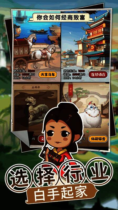 这是一款富有民族风格、内容有趣的模拟商业手游。玩家能扮演老板、店主和庄主,在古代进行招聘、升级产业、赚钱投资等操作。