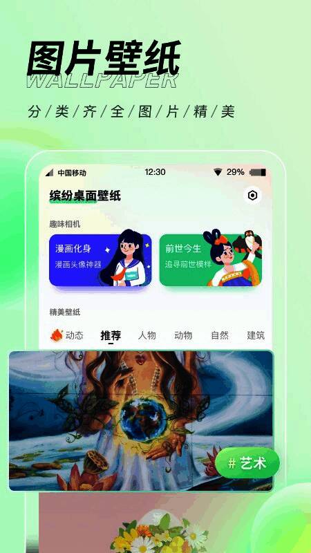 除了丰富的壁纸资源,《缤纷桌面壁纸》还提供了多种趣味拍照功能,例如“前世模样”、“卡通阿凡达”等特色滤镜,让用户不仅能美化桌面,还能创造属于自己的独特头像或社交照片,提升日常使用的趣味性。