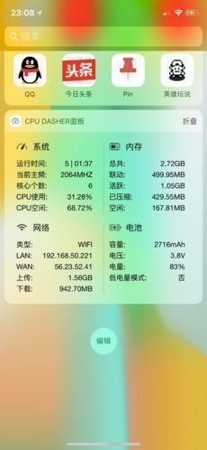 作为一款多功能设备信息查看工具,《CUP Deasher》能实时显示包括CPU运行状态、内存使用情况、电池健康度、网络连接速度以及存储容量等在内的多项关键指标。用户可通过Today插件总览全局,随时掌控设备运行状态,确保系统稳定高效。