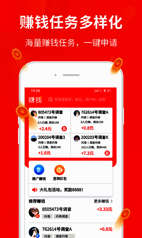 [有空就能赚]只要有时间和手机,点击屏幕就能赚钱。[红包惊喜多]惊喜红包和平台红包均可领取。[浏览也获利]浏览阅读平台信息即可有收获。【任务稳赚钱】完成新手任务和日常必做任务,每日都有收益。