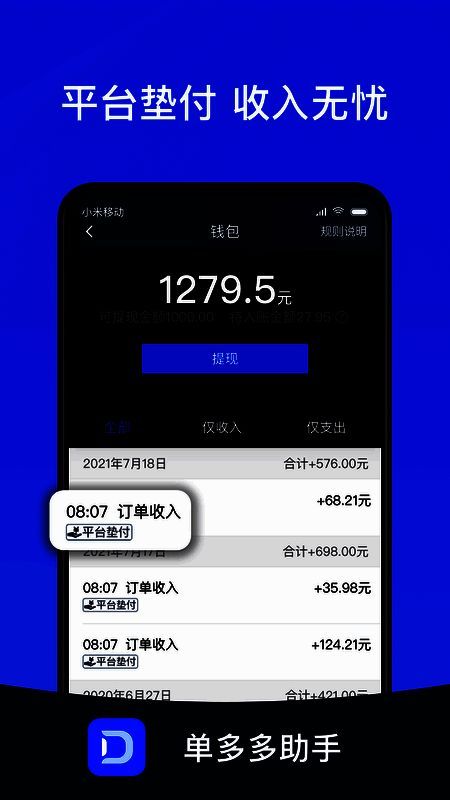 3. 清晰入账明细:单多多助手app提供清晰的入账明细,司机可随时查看自己的收入情况,涵盖订单金额、奖励金额、提现记录等,让司机使用平台更放心。
