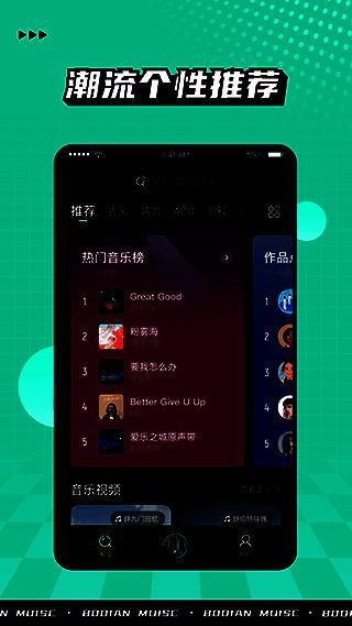 波点音乐苹果版采用简洁清爽的界面风格,整体美观大方。黑色与荧光绿的色调搭配符合年轻人审美,使用户使用时更舒适愉悦。