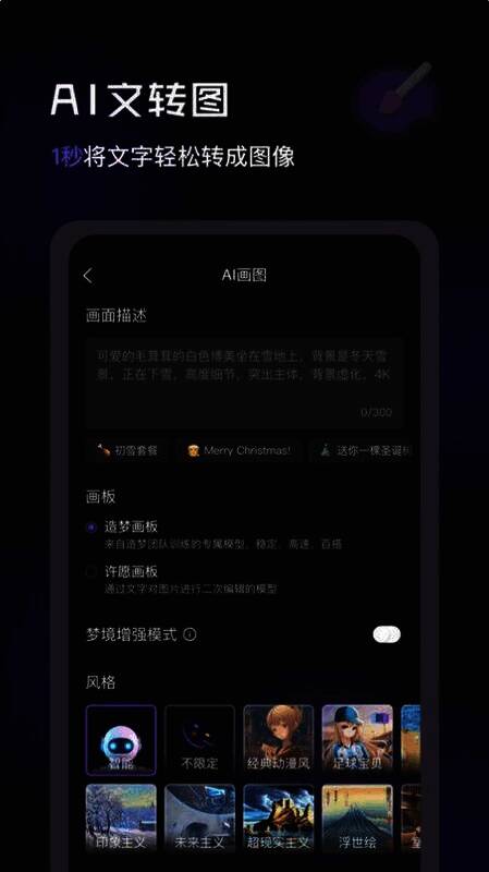 造梦日记AI绘画是一款极为出色的绘图工具,运用了最先进的人工智能技术,为设计师和艺术家带来更多灵感与高端创作工具。软件支持多种操作模式,便于用户自由操作并能立即预览效果。它具备强大的智能自适应开发能力,可自动调整不同颜色和材料的用量,确保画板质量上乘,极大地节省了设计师的工作时间。同时,软件包含多种颜色和画笔,每个细节都经过精心研究与设计,充分保障了绘图的质量和美感。