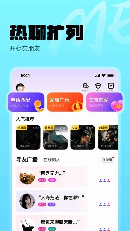 me语音是一款极为专业的语音社交软件!该软件汇聚了众多小哥哥小姐姐,我们能在平台上体验各种有趣的社交功能。其设计简约,操作便捷,你在此能邂逅超多有趣之人,还能与心仪用户开展语音互动交友,让你不再孤单。喜欢交友的你千万别错过!