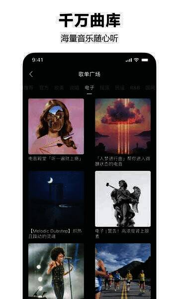 功能操作简单,界面风格酷炫,能快速播放各类音乐,提供不同音乐类别供用户选择。
