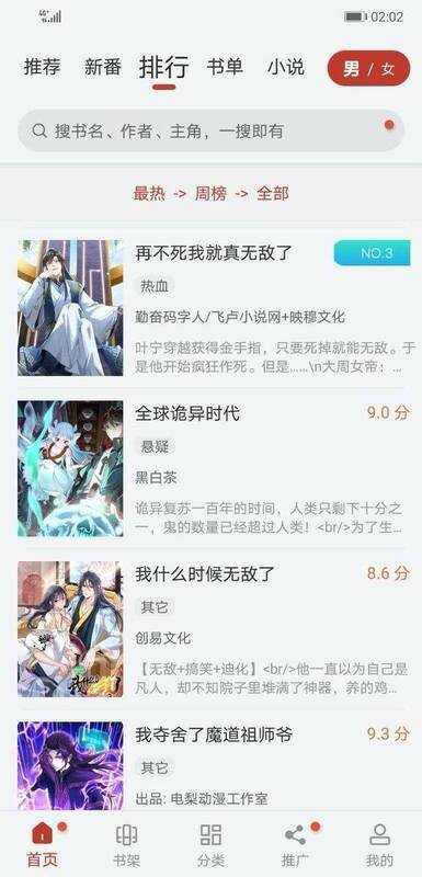 可将喜欢的漫画添加到书架,自动保存进度,方便下次继续观看。分类详细,便于搜索喜爱内容。不仅有漫画资源,还有小说资源,能满足各种阅读需求。还能在男女频道快速切换,为不同用户群体提供不同内容推荐。