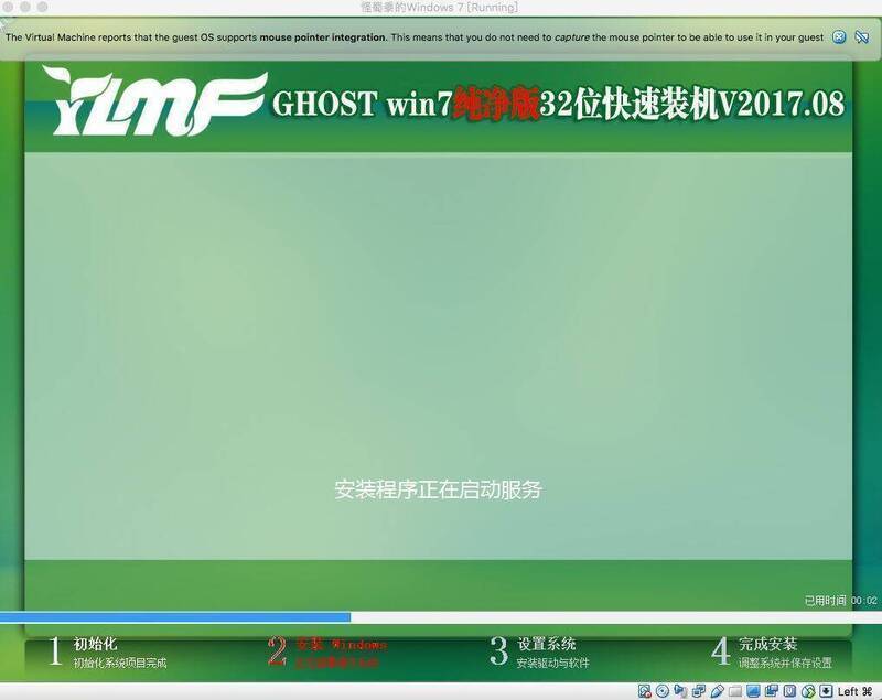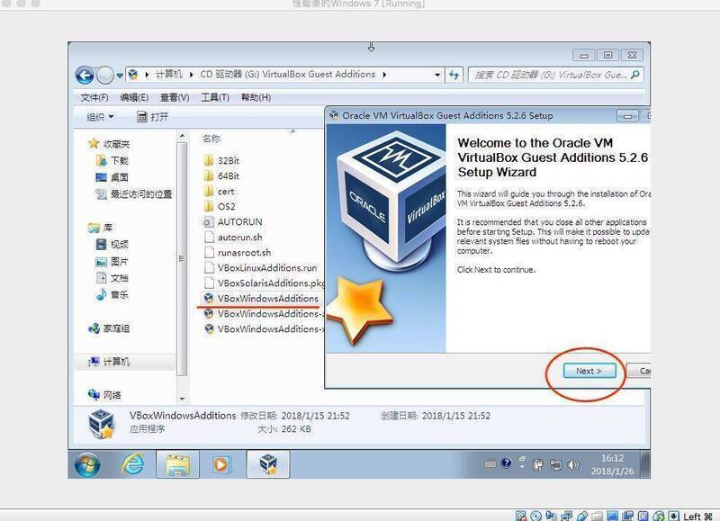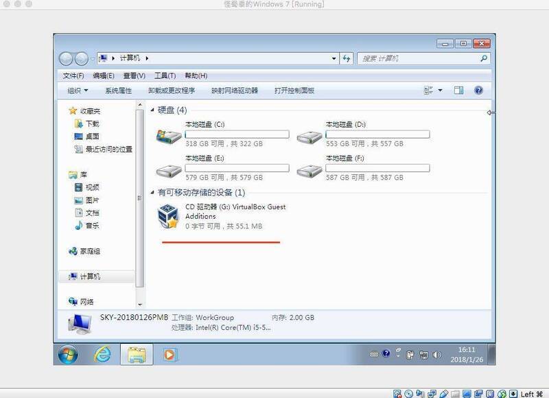 1、Windows7安装完成后,已经可以正常使用,但是此时会有很多不便,比如拖动虚拟机窗口会导致系统两边留空白,需要快捷键(command)才能实现Mac和win7系统切换等等。这时可以通过安装VirtualBox Guest Additions改善这些状况,它包含了可优化操作系统以实现更佳性能和可用性的设备驱动程序和系统应用程序。