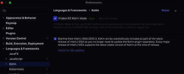 在 IntelliJ IDEA 2024.3 中,K2 模式正式脱离 Beta,现已处于稳定状态并可供大范围使用。 K2 模式可以显著提高 Kotlin 代码分析的稳定性、内存消耗效率和 IDE 的整体性能。 K2 模式现在提供改进的与 Java 的功能对等,以及对所有 Kotlin 2.1 功能的支持。 要探索其功能,请转到 Settings/Preferences | Languages & Frameworks | Kotlin(设置/偏好设置 | 语言和框架 | Kotlin)。