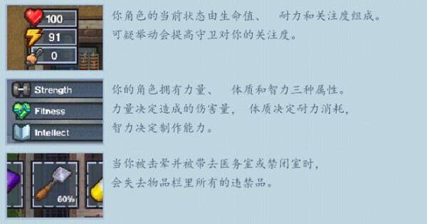 牢房:每晚你都要回到牢房内休息,如果被发现不在牢房内,监狱会开始大面积搜查。