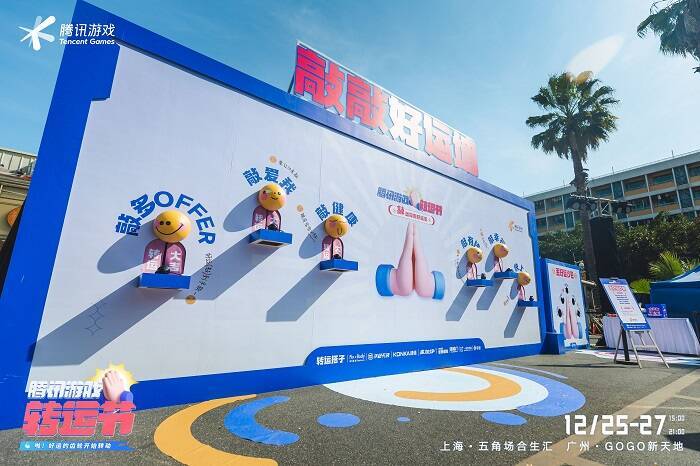 活动现场,腾讯游戏打造了“好运广场”、“敲敲好运墙”等一系列趣味装置和游戏环节,吸引到周边众多高校学生和年轻玩家前来打卡体验;同时汇集旗下《王者荣耀》《和平精英》《英雄联盟》《天涯明月刀》《高能英雄》《暗区突围》《QQ炫舞》《欢乐斗地主》《桃源深处有人家》《光与夜之恋》多个人气IP,以游戏情怀为纽带,从“虚拟”走向线下,陪伴年轻玩家感受欢快、温馨的年末氛围,一起迎接新年好运。
