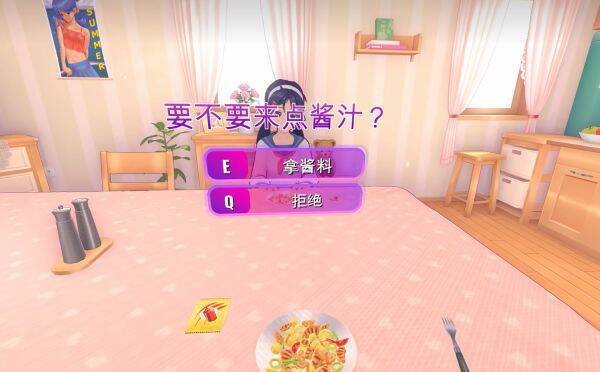 在吃饭时我们选择“拿酱汁”接着将剪刀递给米塔帮助他剪开酱料。