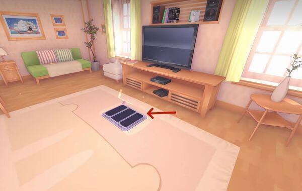 接着在客厅的地面上,找到跳舞毯,并邀请米塔一起进行跳舞小游戏。
