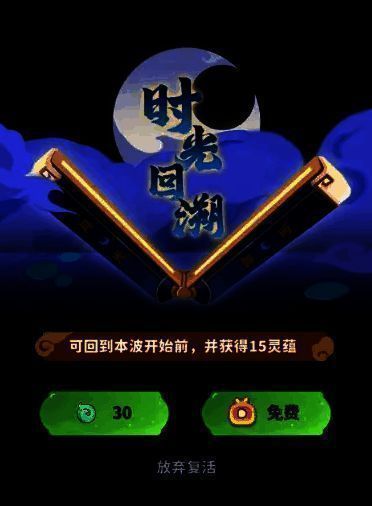 当主角血量为0,即触发时光回溯。10秒内可选择使用30仙玉/观看广告复活,若倒计时结束未进行任何选择,系统则视为放弃复活哟~