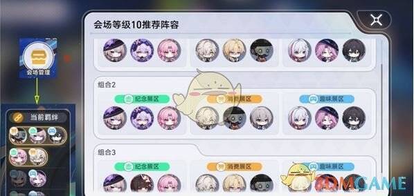 会场管理会给你推荐几种组合,皆为当前会场等级互拐不错的方案,对照安排角色即可。