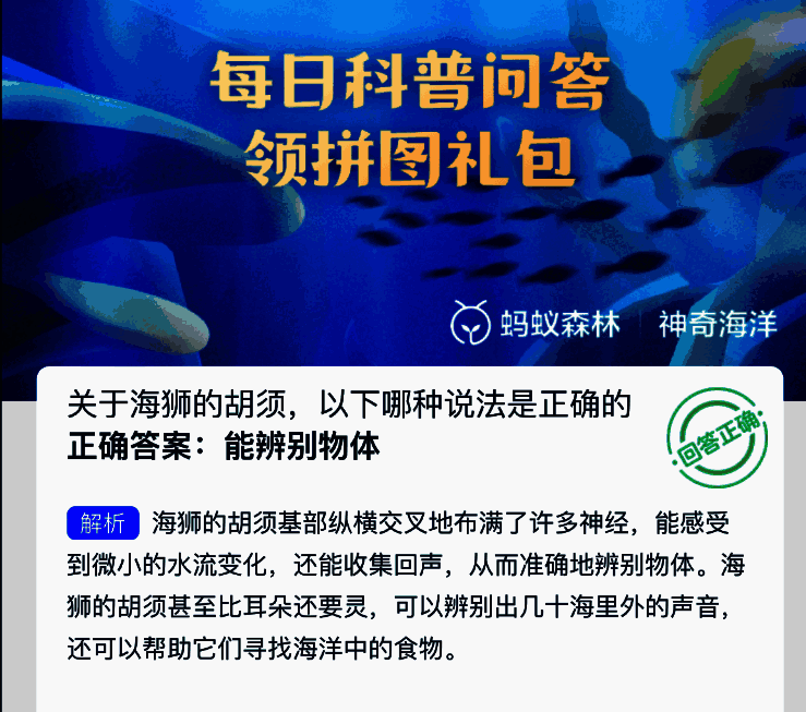 支付宝蚂蚁森林神奇海洋2025年4月11日问题已经更新,今日题目是:关于海狮的胡须,以下哪种说法是正确的?正确答案是:【能辨别物体】。海狮的胡须基部纵横交叉地布满了许多神经,能感受到微小的水流变化,还能收集回声,从而准确地辨别物体。