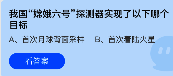 我国“嫦娥六号”探测器实现了以下哪个目标?这是支付宝蚂蚁庄园小鸡答题4月12日题目,支付宝小鸡答题是大家非常喜欢的活动,大家获取饲料就可以喂养小鸡领取更多的蛋去帮助更多的人了!今日正确答案是【首次月球背面采样】,2024年6月2日6时23分,嫦娥六号成功着陆在月球背面南极-艾特肯盆地预选着陆区,开启人类探测器首次在月球背面实施的样品采集任务。