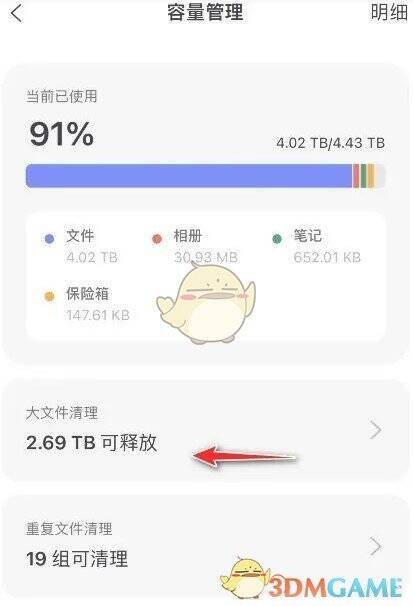 3、在容量管理界面中点击大文件清理或重复文件清理选项。