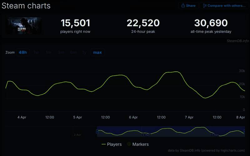 《最后的生还者2:重制版》Steam在线玩家数呈现出强劲趋势。据Steamdb数据显示,当前在线人数为15501人,24小时内峰值为22520人,历史峰值高达30690人。