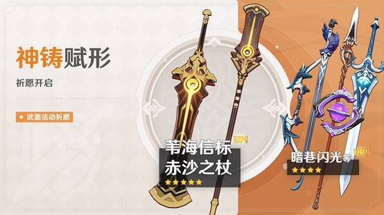 除此之外,「神铸赋形」活动祈愿也已开启,限定五星武器「双手剑·苇海信标」、「长柄武器·赤沙之杖」 将迎来概率UP!