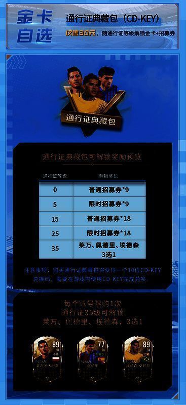 1. 新品【通行证典藏包】:只需30元,奖励跟随通行证等级解锁,招募券、金卡球员等你领取。达到指定等级后,可直接获得3选1金卡礼包,佩德里、埃德森、莱万任你选择!(该商品为CD-KEY类型,直播间购买获得兑换码后,需玩家前往游戏内激活)