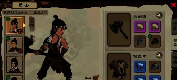 第二步开启装备。玩家进入勇士属性页面中,打开右侧的装备列表,这里展示了进攻铁剑、防御布甲等。